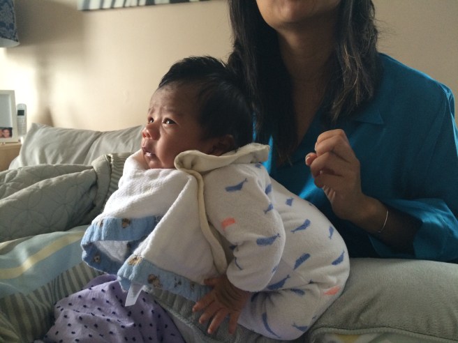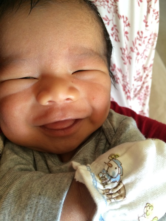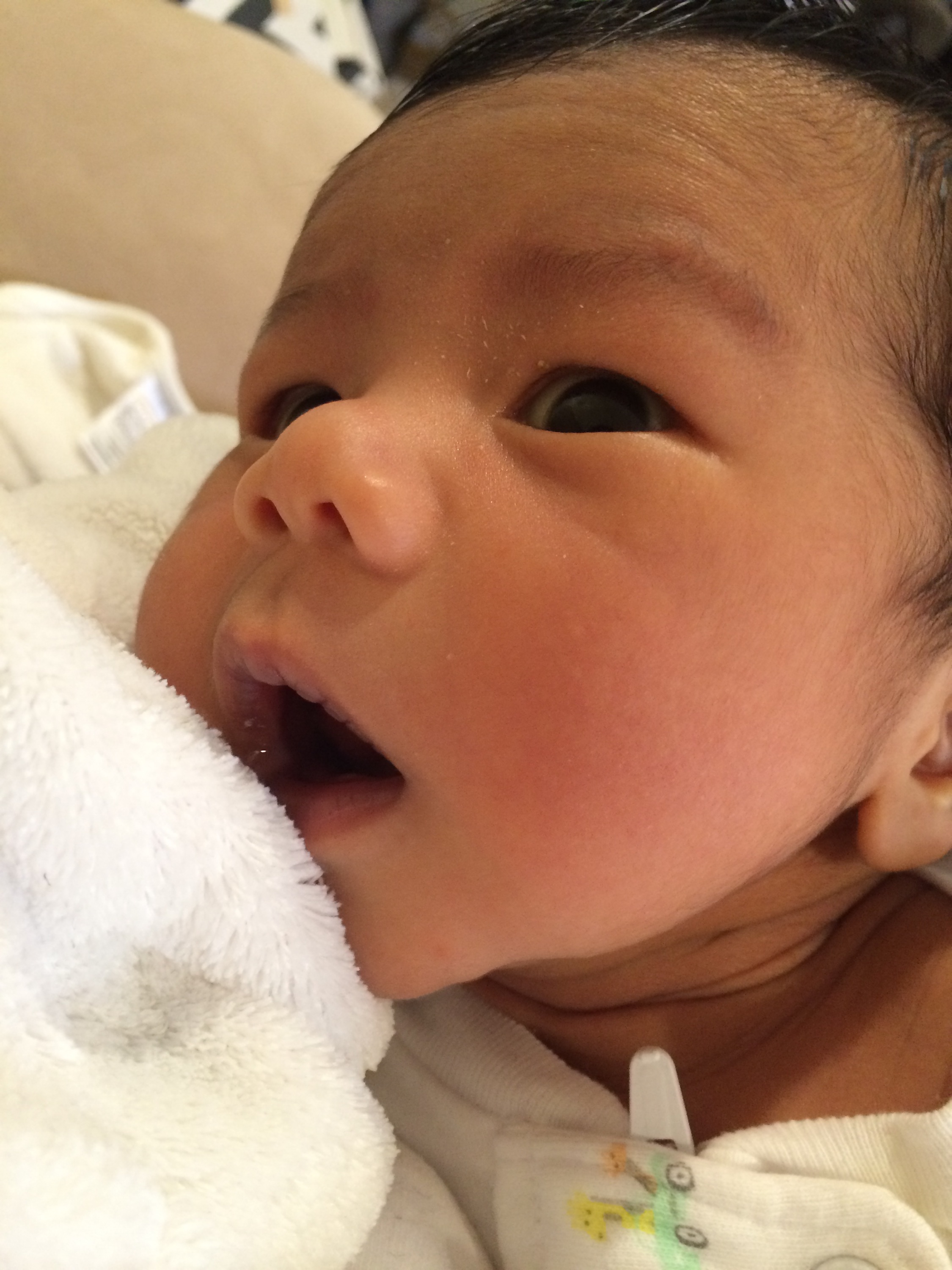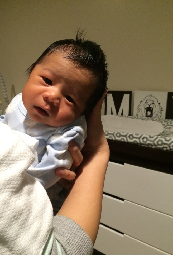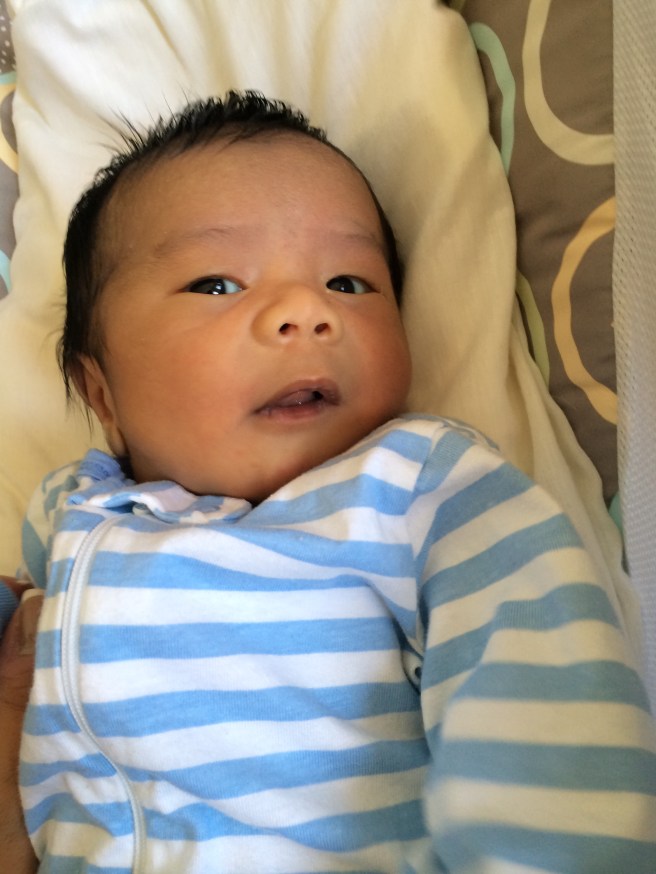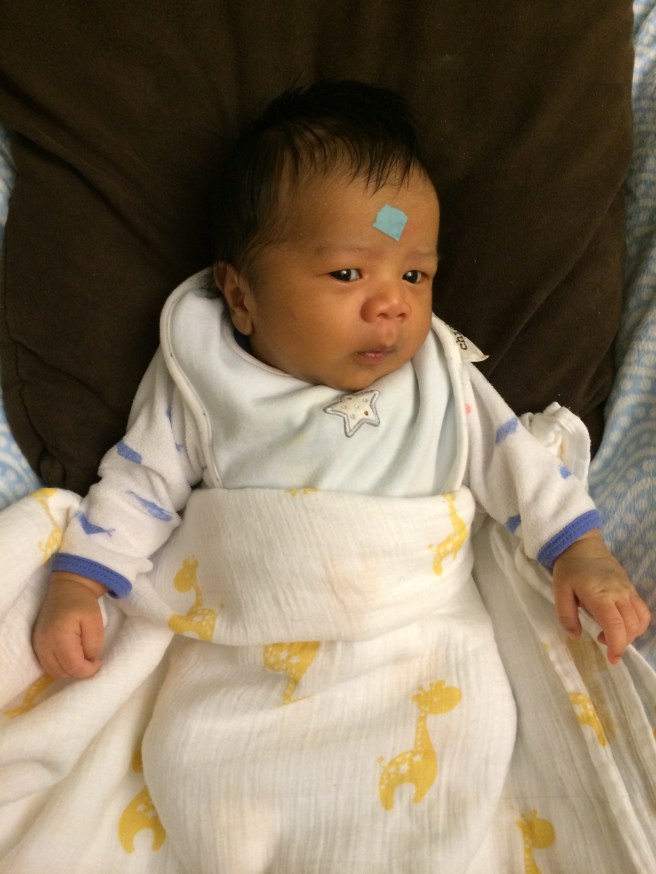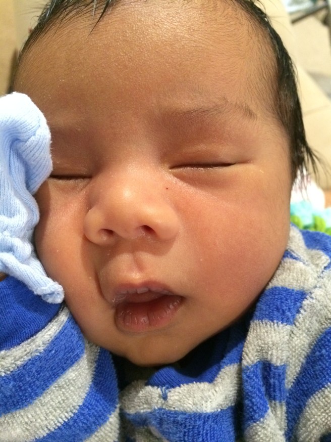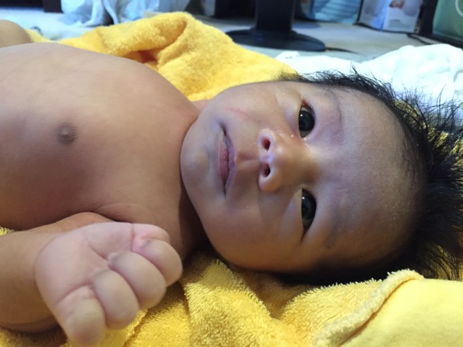 He’s almost one month old. Max loved the bath, and we finally put lotion on his skin…